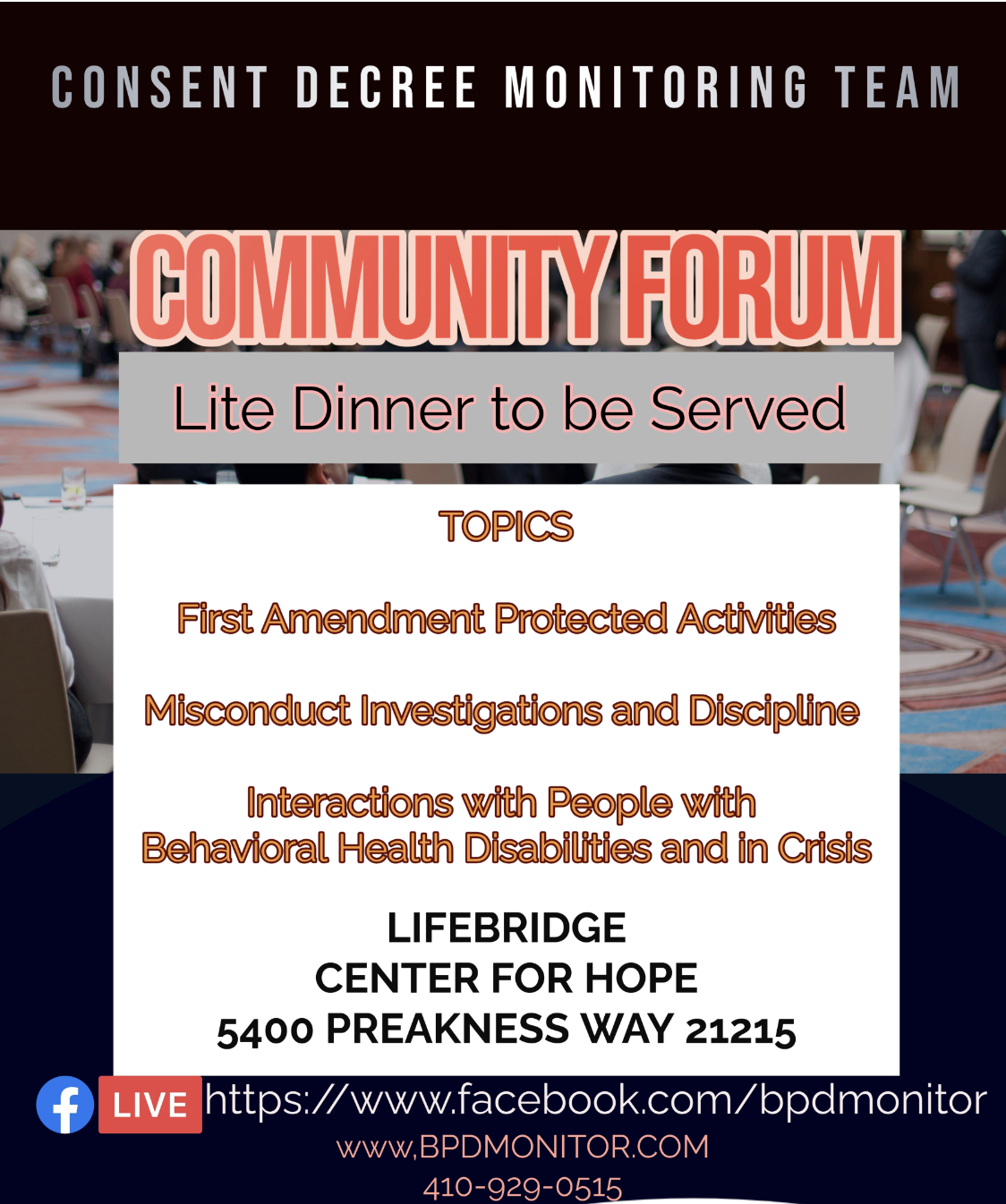 Join members of the Monitoring Team for our First Quarter Community Forum. Topics include; Use of Force, First Amendment Protected Activities, Misconduct & Discipline, Supervision, and the CIT Assessment. Join us at the University of Baltimore inside the Angelos Law Center in the Moot Court Room at 1401 N. Charles Street, Baltimore, MD 21201 at 6 PM. The event will also be available via live stream on the Monitoring Team’s Facebook page.